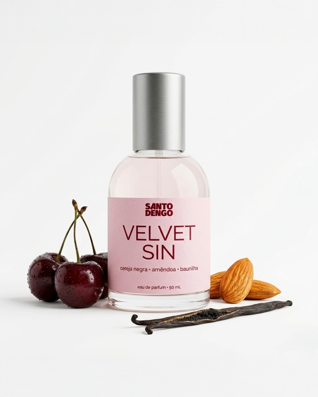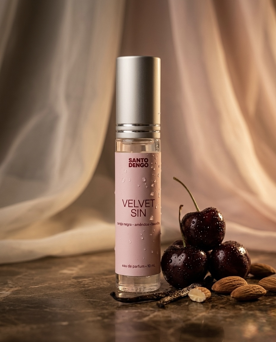 A cereja negra abre o perfume com aquela doçura escura e imediata — não a cereja artificial dos balas e refrigerantes, mas a cereja madura, quase fermentada, com aquele toque levemente alcoólico que lembra licor artesanal sendo preparado numa cozinha de alguém que sabe o que está fazendo. A amêndoa aparece logo depois e muda tudo. Ela traz profundidade e uma amargor sofisticado que transforma o doce em complexo, o simples em intrigante. É a nota que faz as pessoas chegarem mais perto para tentar entender o que estão sentindo — e ficarem sem resposta satisfatória.
